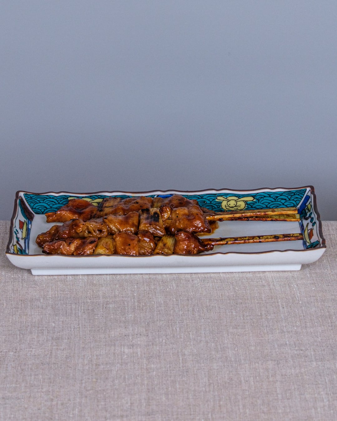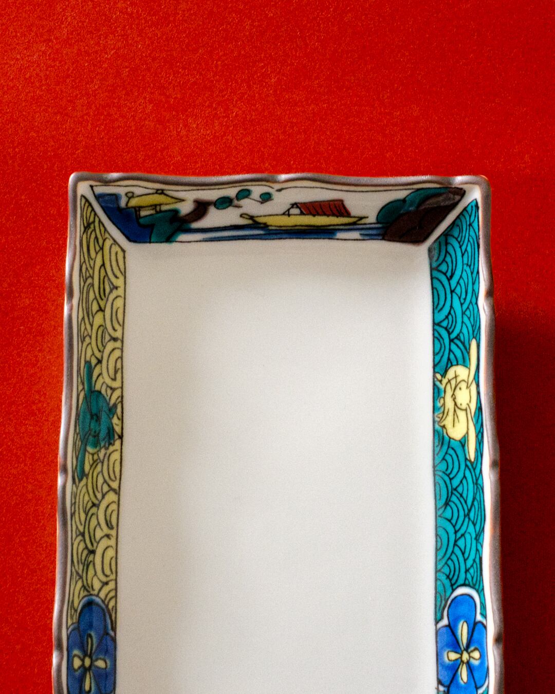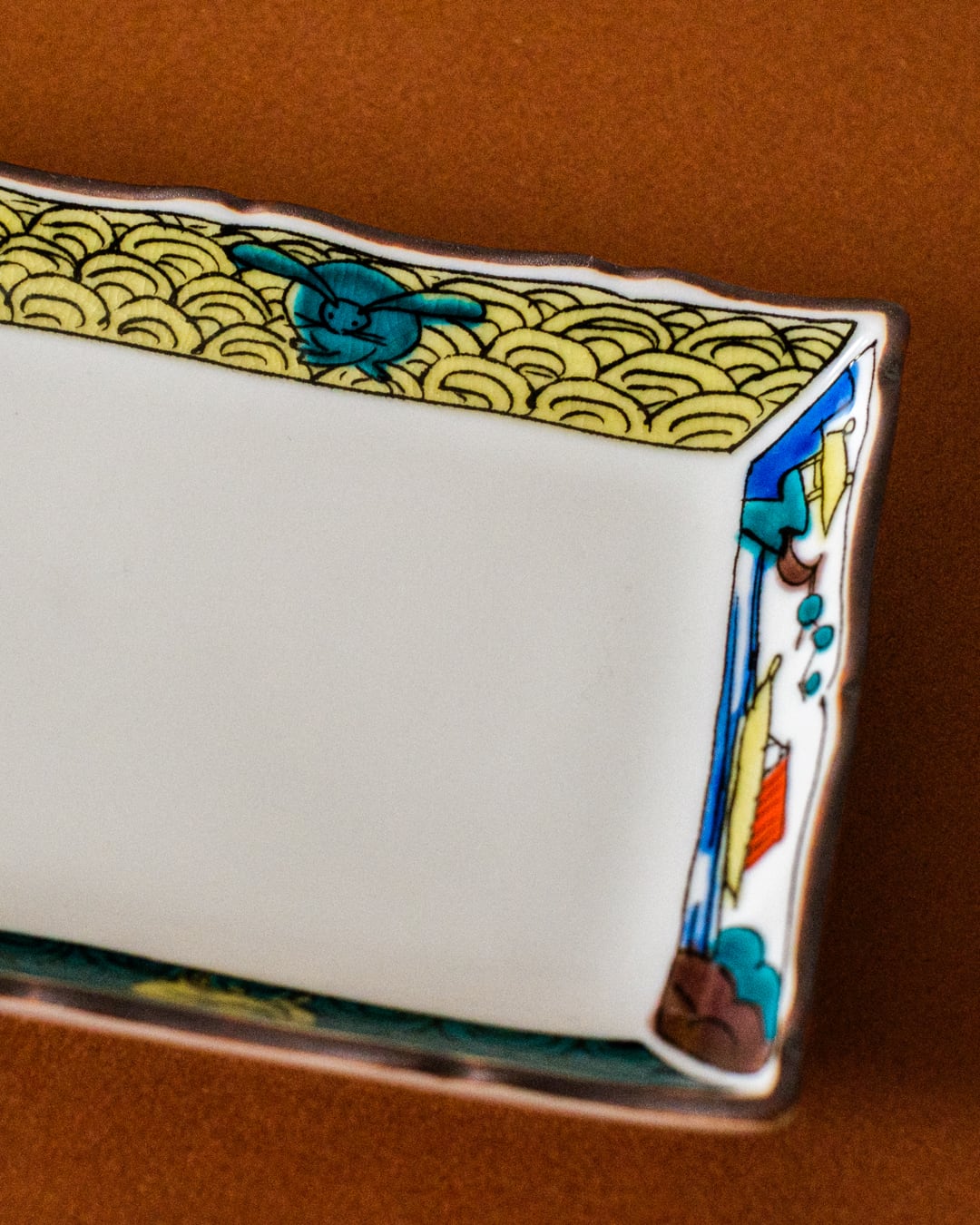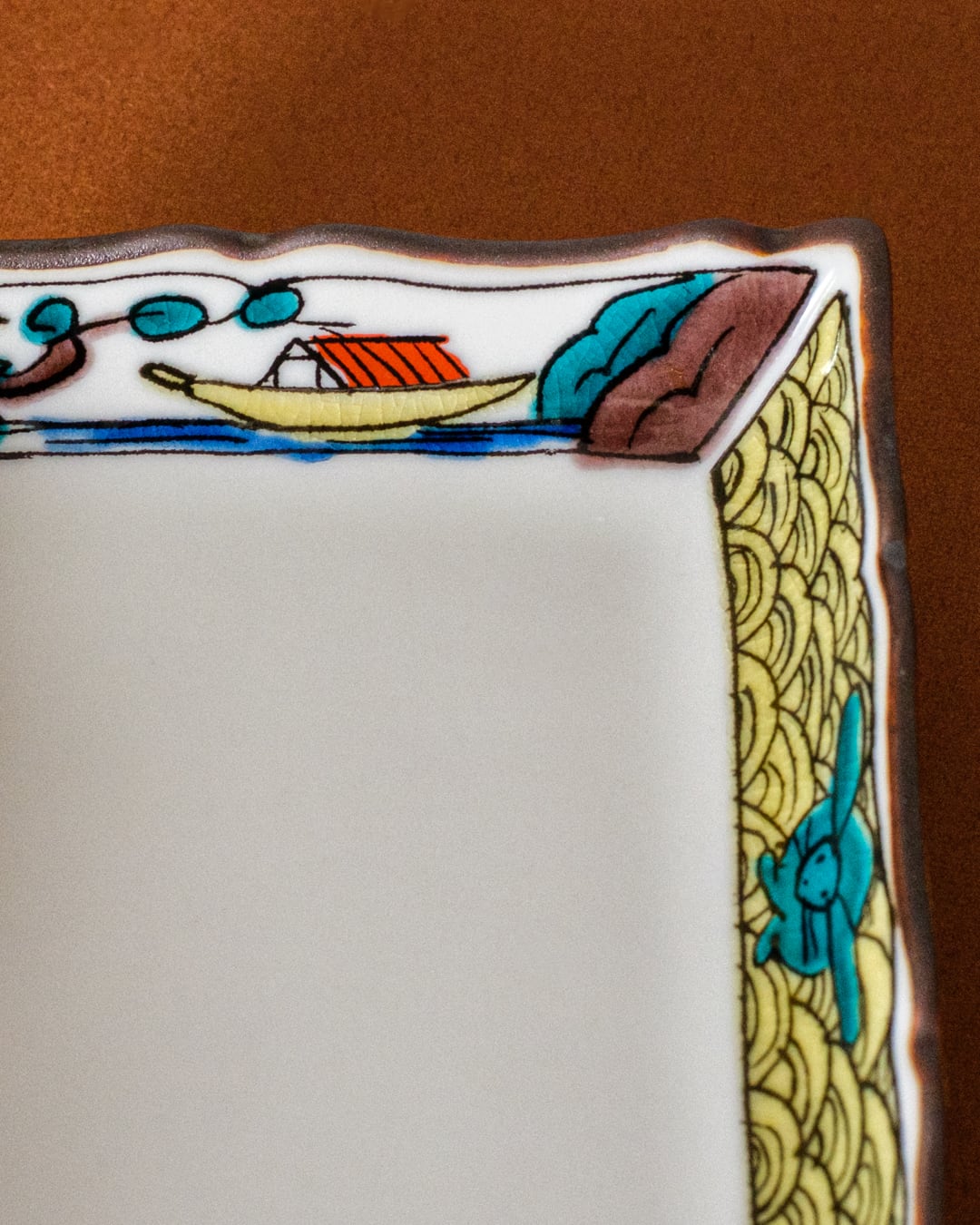海を渡る兎は古九谷(江戸前期に焼かれた初期(1655-1658)の九谷焼)をモチーフにしています。青(緑)と黄色の組み合わせは九谷焼らしい色合いと言えます。