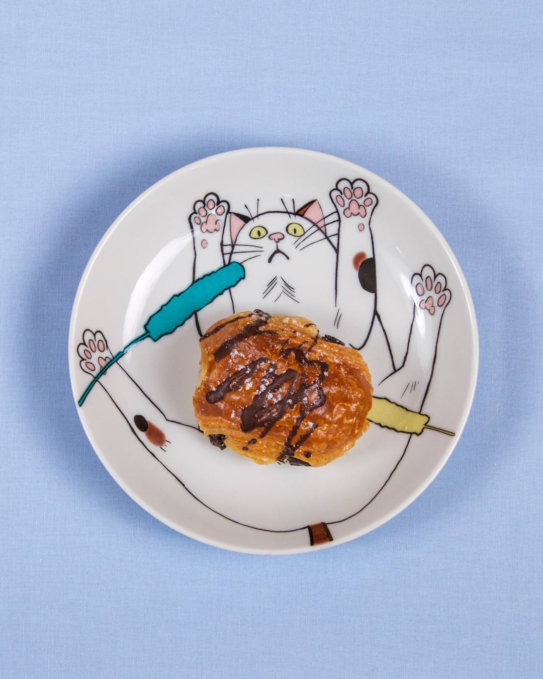 自由気ままな猫にジェラシーを感じている現代社会へお届けするネコ・ジェラシーシリーズ。こちらは取り皿にちょうど良いサイズのプレートです。フルーツやお菓子などを盛り付けて、腹を向けるとびみけ柄の表情を楽しんでください。猫じゃらしで遊ぶ猫のように食事中のテンションもUPしちゃう楽しい食器です。