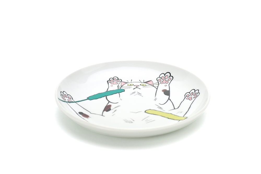 自由気ままな猫にジェラシーを感じている現代社会へお届けするネコ・ジェラシーシリーズ。こちらは使い勝手の良いサイズのプレートです。ケーキやパンをのせ、大きな腹を向けたとびみけ柄のネコと楽しく食事はいかがですか。猫じゃらしで遊ぶ猫のように食事中のテンションもUPしちゃう楽しい食器です。