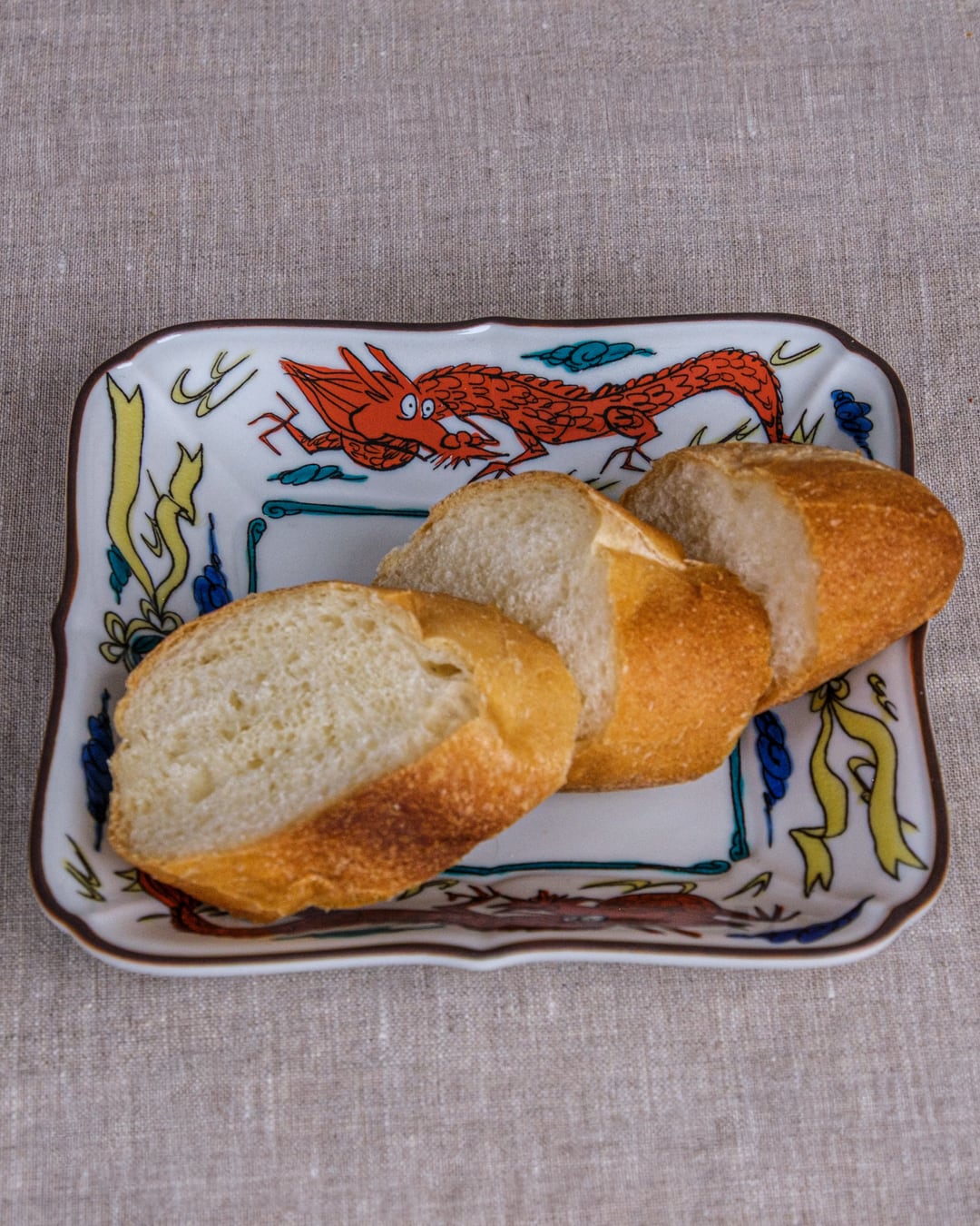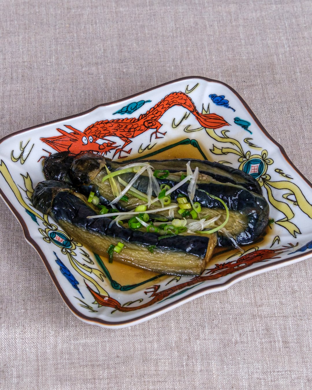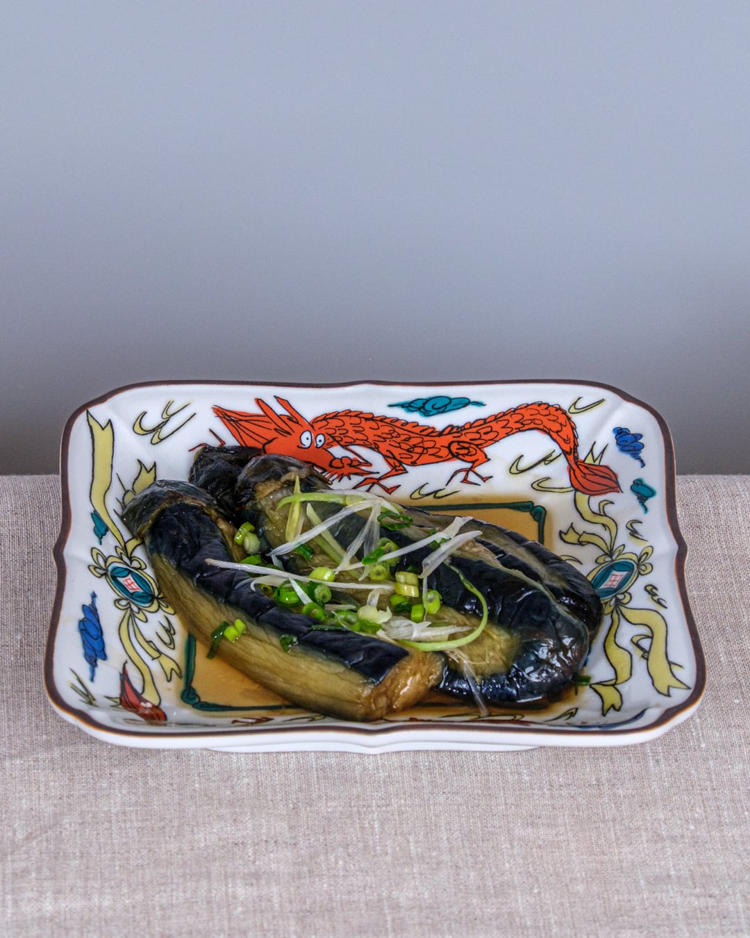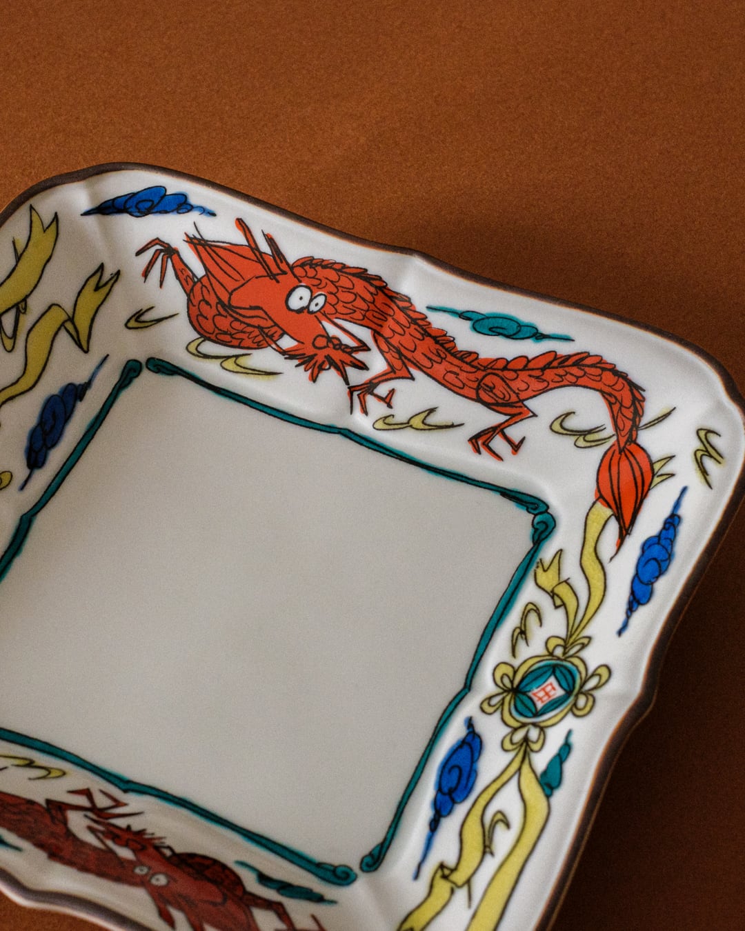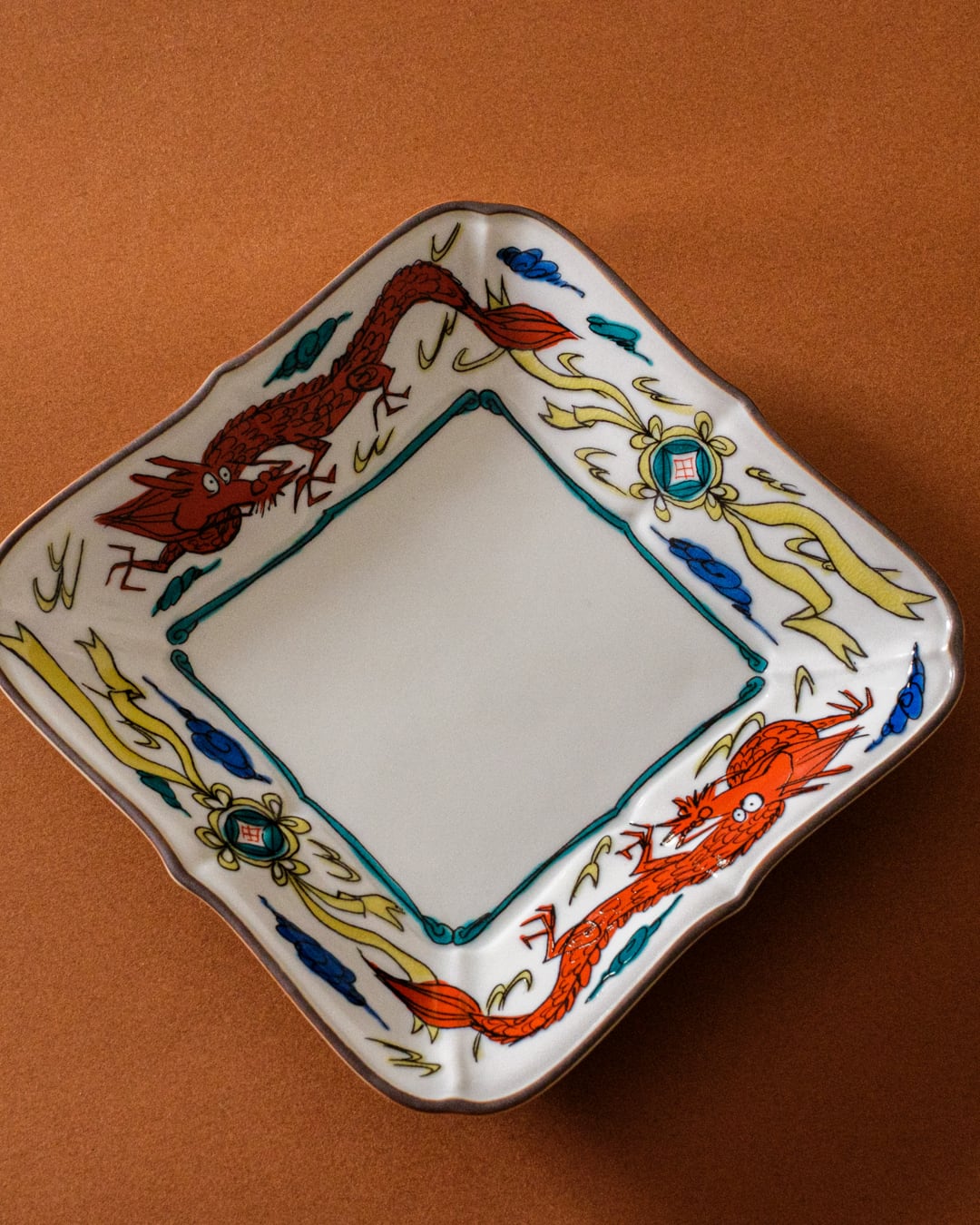 雲龍を描いたリム部分が額縁のように料理を引き立てます。銘々皿としても使えますが、存在感があるので、いろいろな器との相性もよく、どんな料理も受け止めてくれる器です。