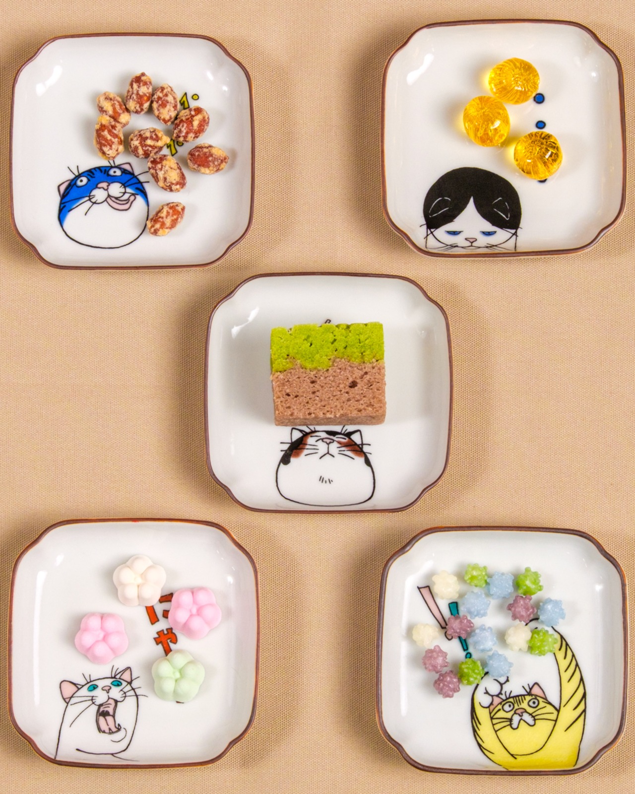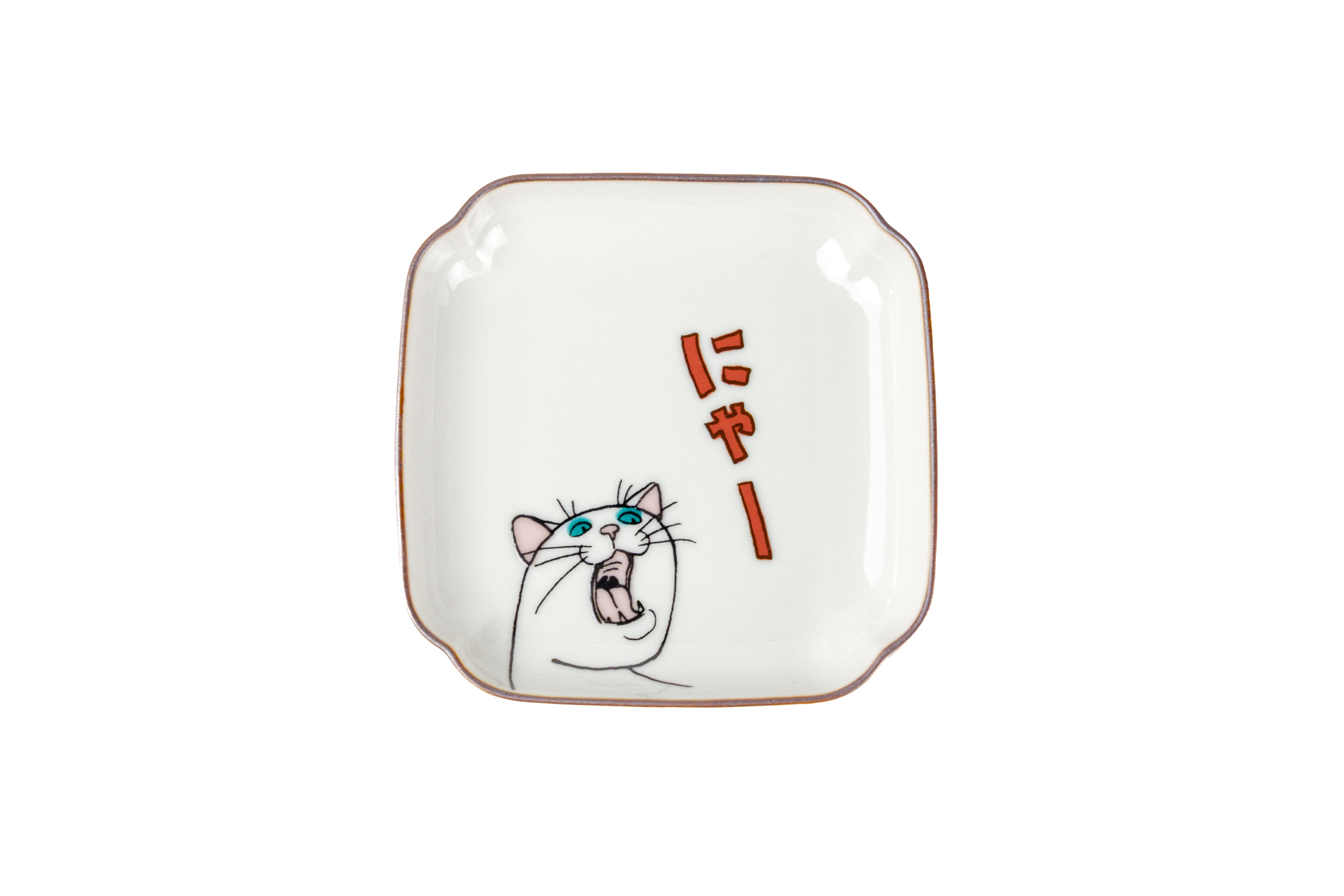 自由気ままな猫にジェラシーを感じている現代社会へお届けするネコ・ジェラシーシリーズ。こちらは口を開けて鳴く白い猫の角小皿。お菓子やおかずは猫の顔をさけて載せるとかわいく楽しめます。猫じゃらしで遊ぶ猫のように食事中のテンションもUPしちゃう楽しい食器です。