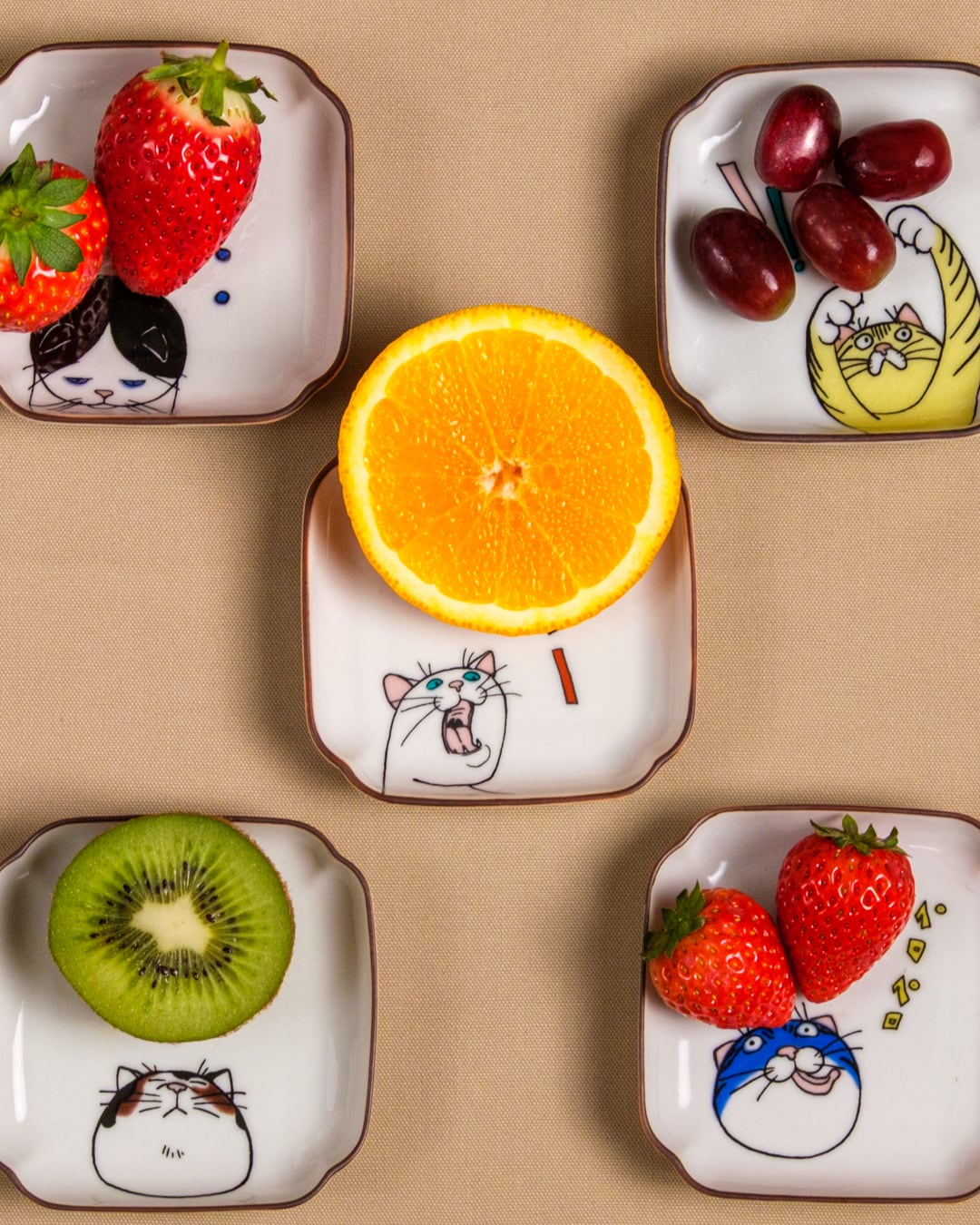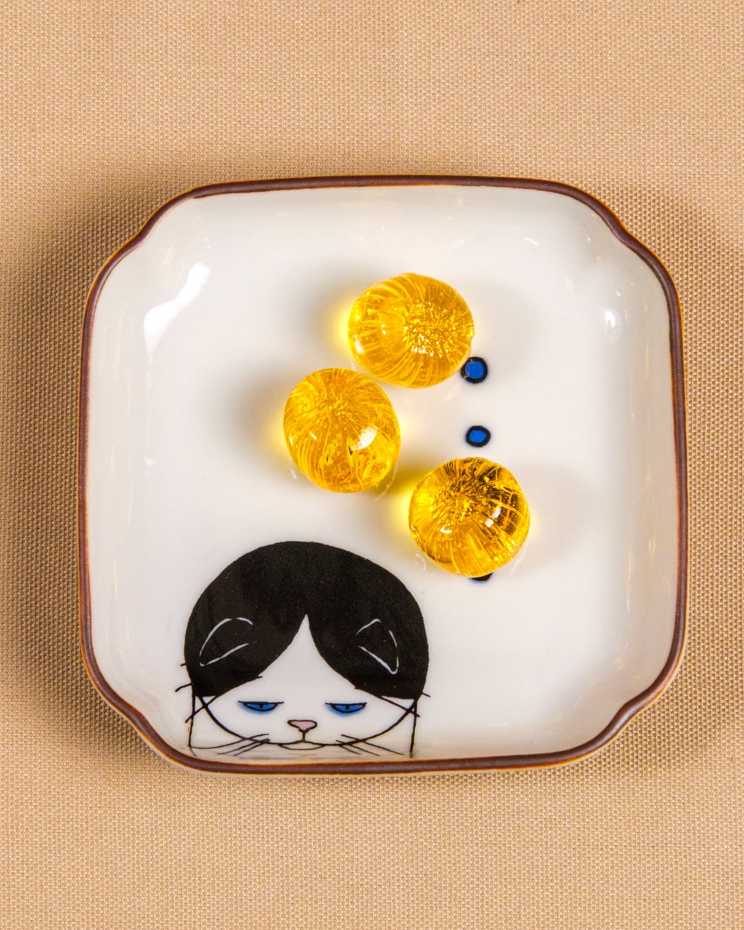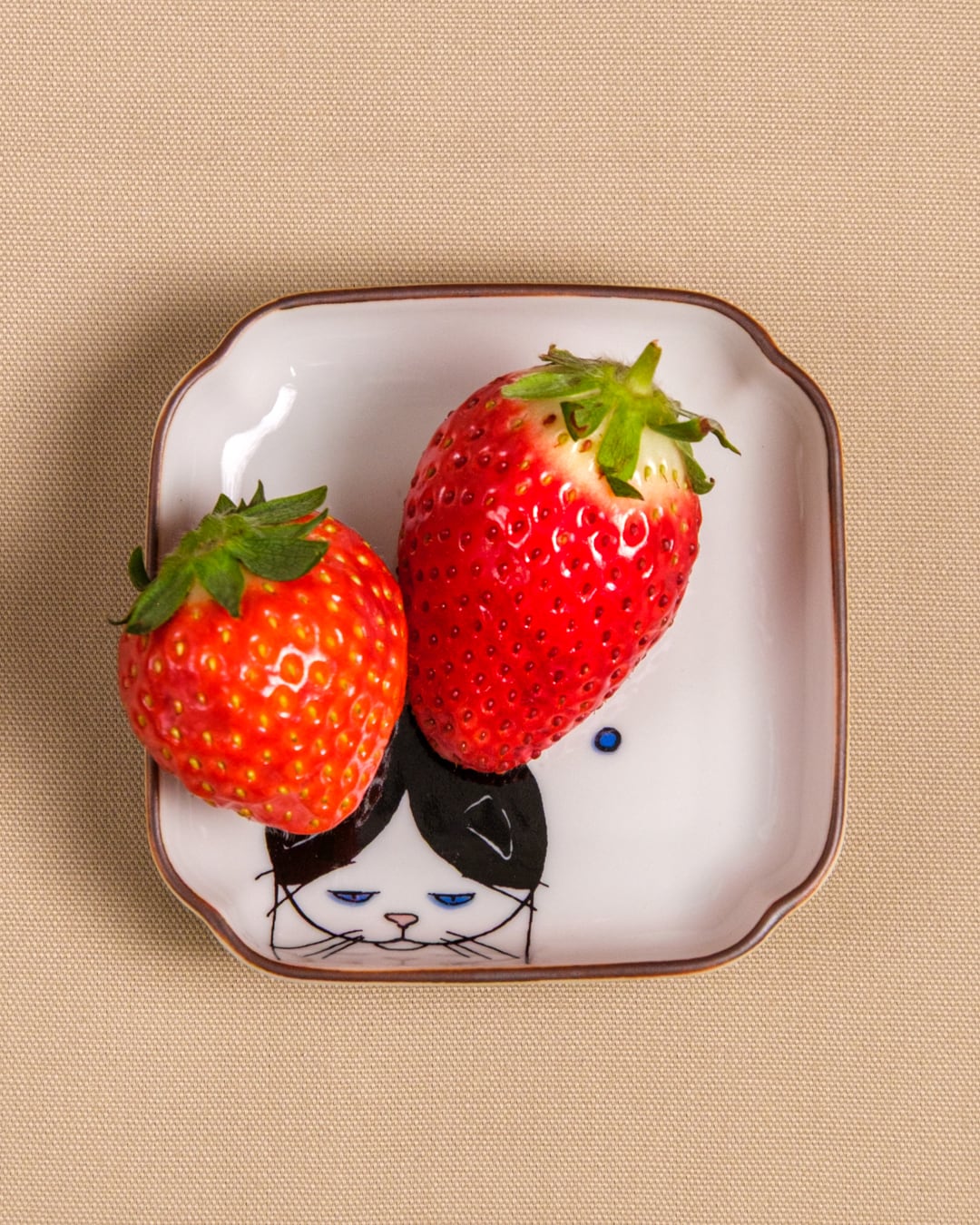 自由気ままな猫にジェラシーを感じている現代社会へお届けするネコ・ジェラシーシリーズ。こちらは・・・沈黙する八割れの猫の角小皿。お菓子やおかずは猫の顔をさけて載せるとかわいく楽しめます。猫じゃらしで遊ぶ猫のように食事中のテンションもUPしちゃう楽しい食器です。
