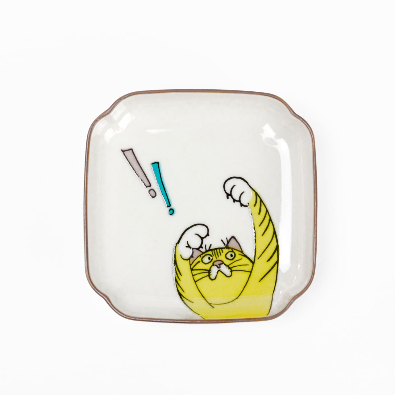 自由気ままな猫にジェラシーを感じている現代社会へお届けするネコ・ジェラシーシリーズ。こちらは飛びつくトラ柄の猫の角小皿。お菓子やおかずは猫の顔をさけて載せるとかわいく楽しめます。猫じゃらしで遊ぶ猫のように食事中のテンションもUPしちゃう楽しい食器です。