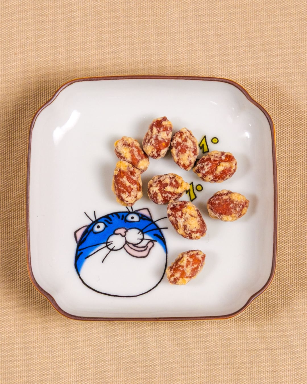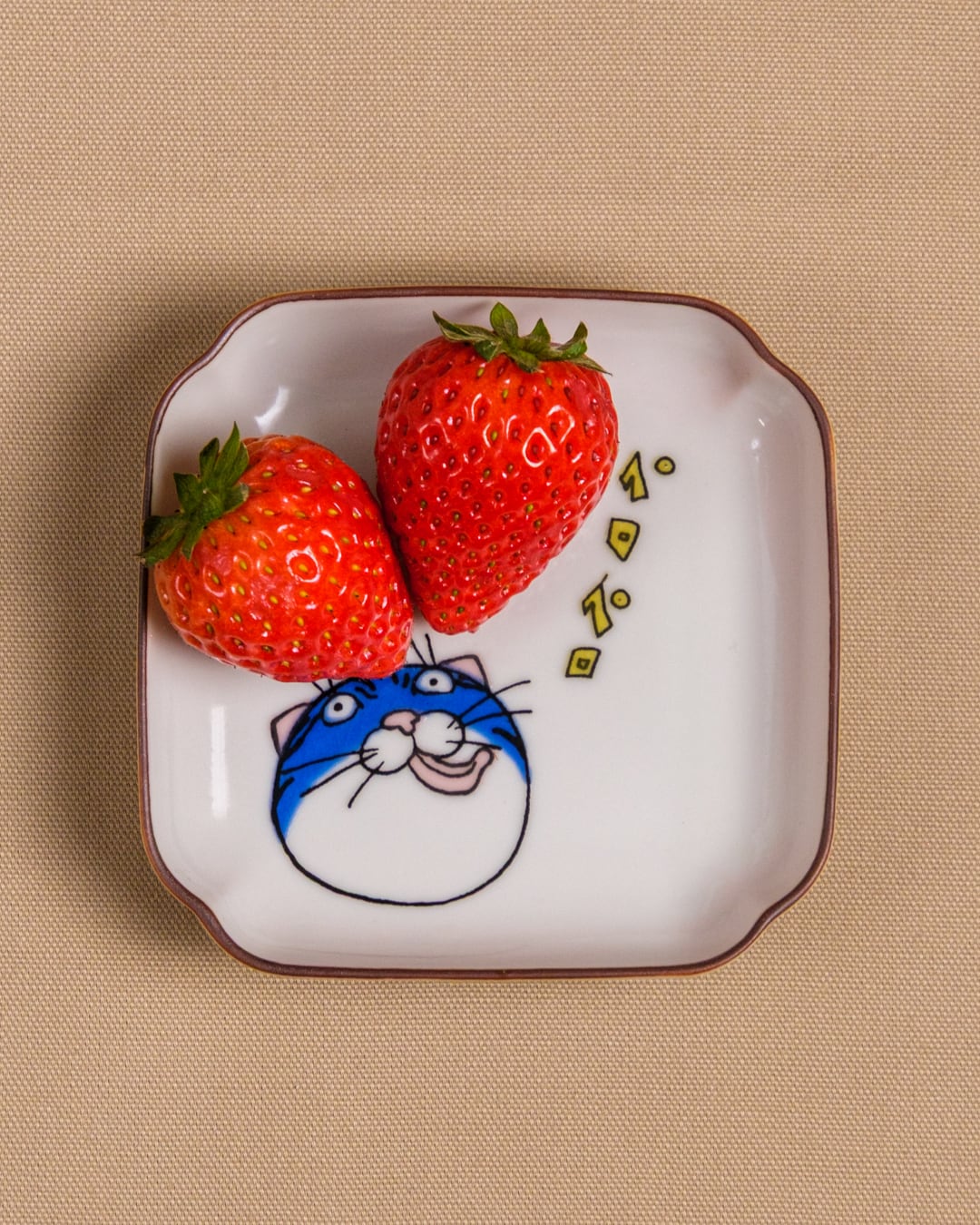 自由気ままな猫にジェラシーを感じている現代社会へお届けするネコ・ジェラシーシリーズ。こちらは舌を出して何かを舐めようとする鯖色のトラ猫の角小皿。お菓子やおかずは猫の顔をさけて載せるとかわいく楽しめます。猫じゃらしで遊ぶ猫のように食事中のテンションもUPしちゃう楽しい食器です。