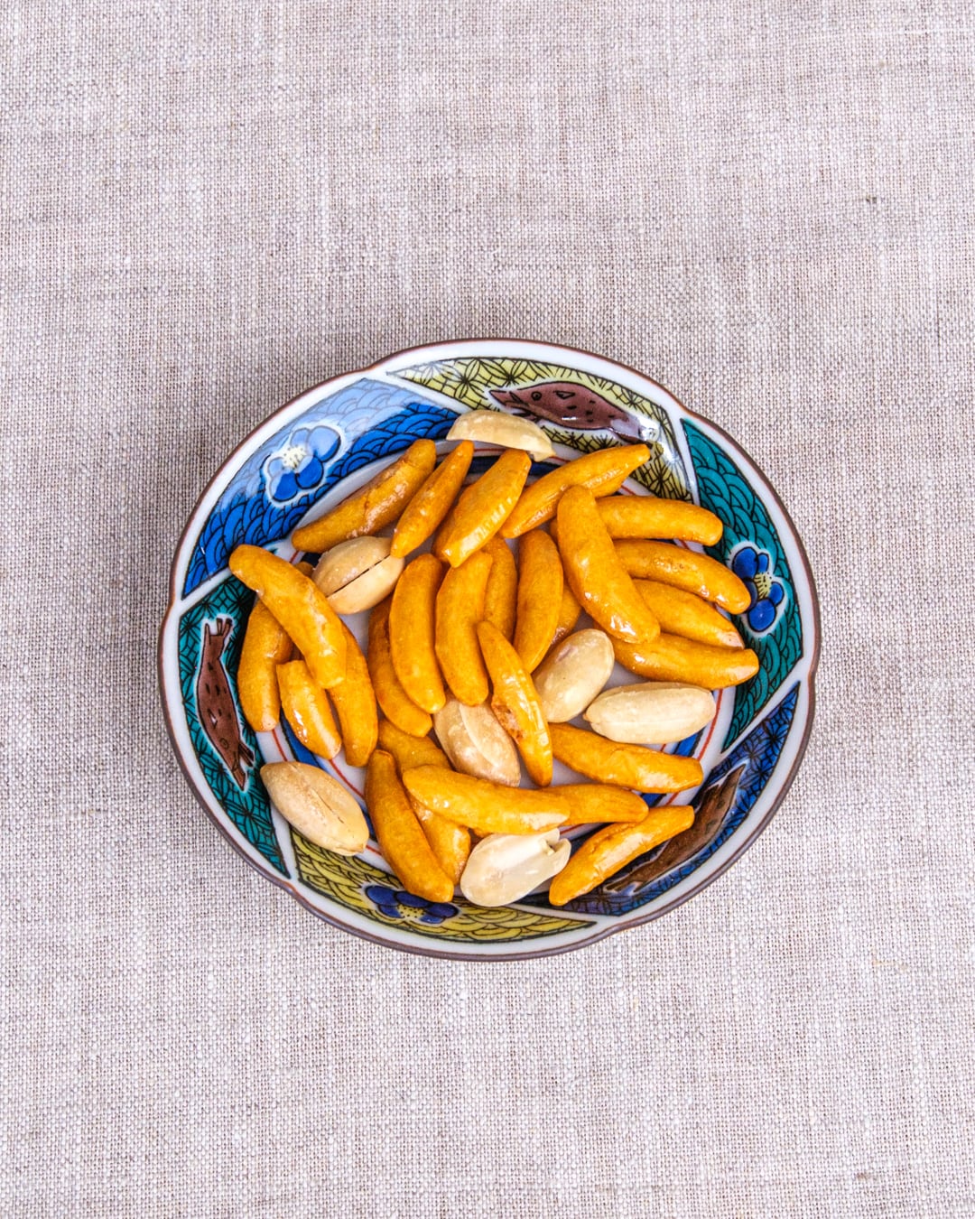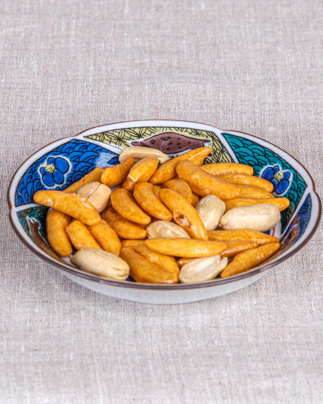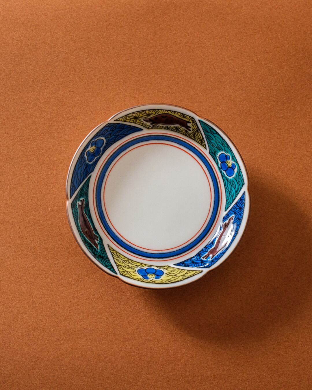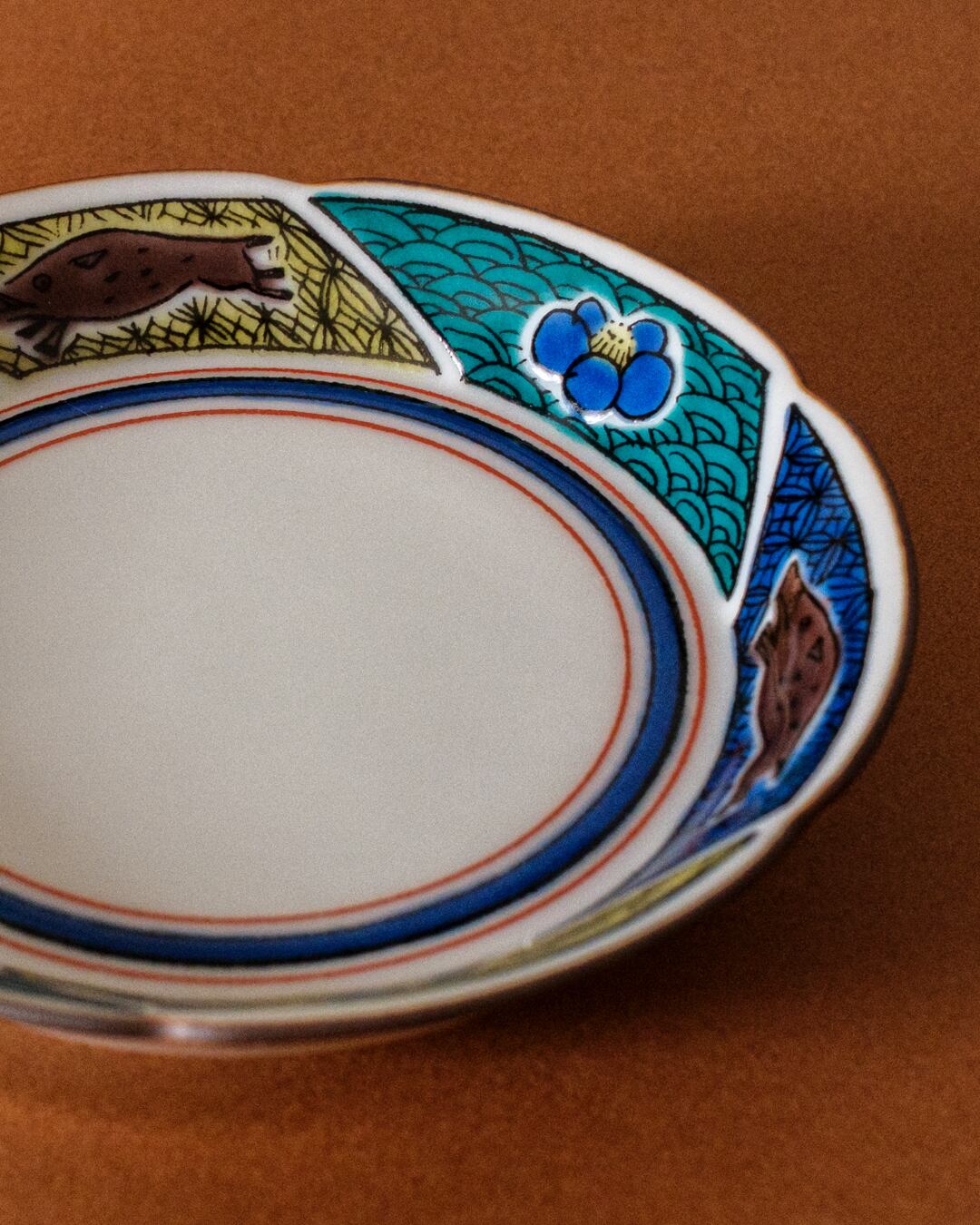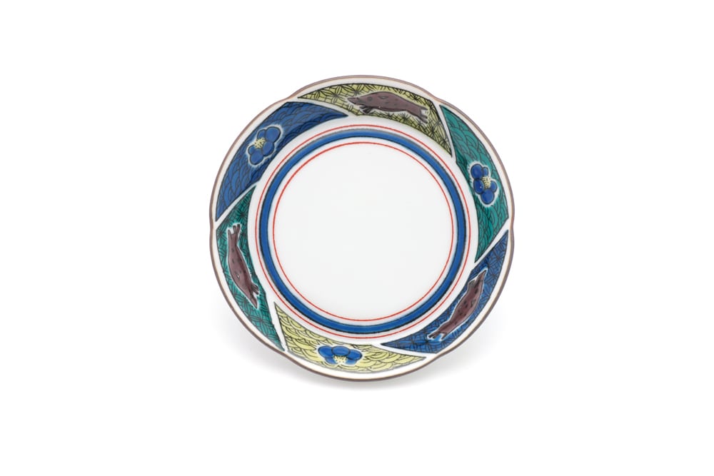 九谷焼らしい小紋の中に、猪と椿の花が追いかけっこしているような文様です。