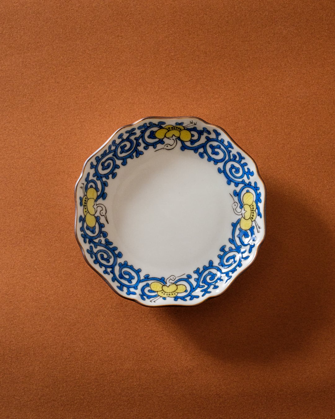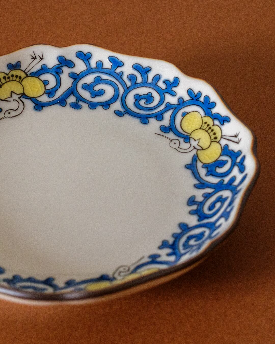 唐草文様が蛸の足のようなのでこう呼ばれています。四方向から”梅に鶴”が器の中心に向かって飛んでいるようです。