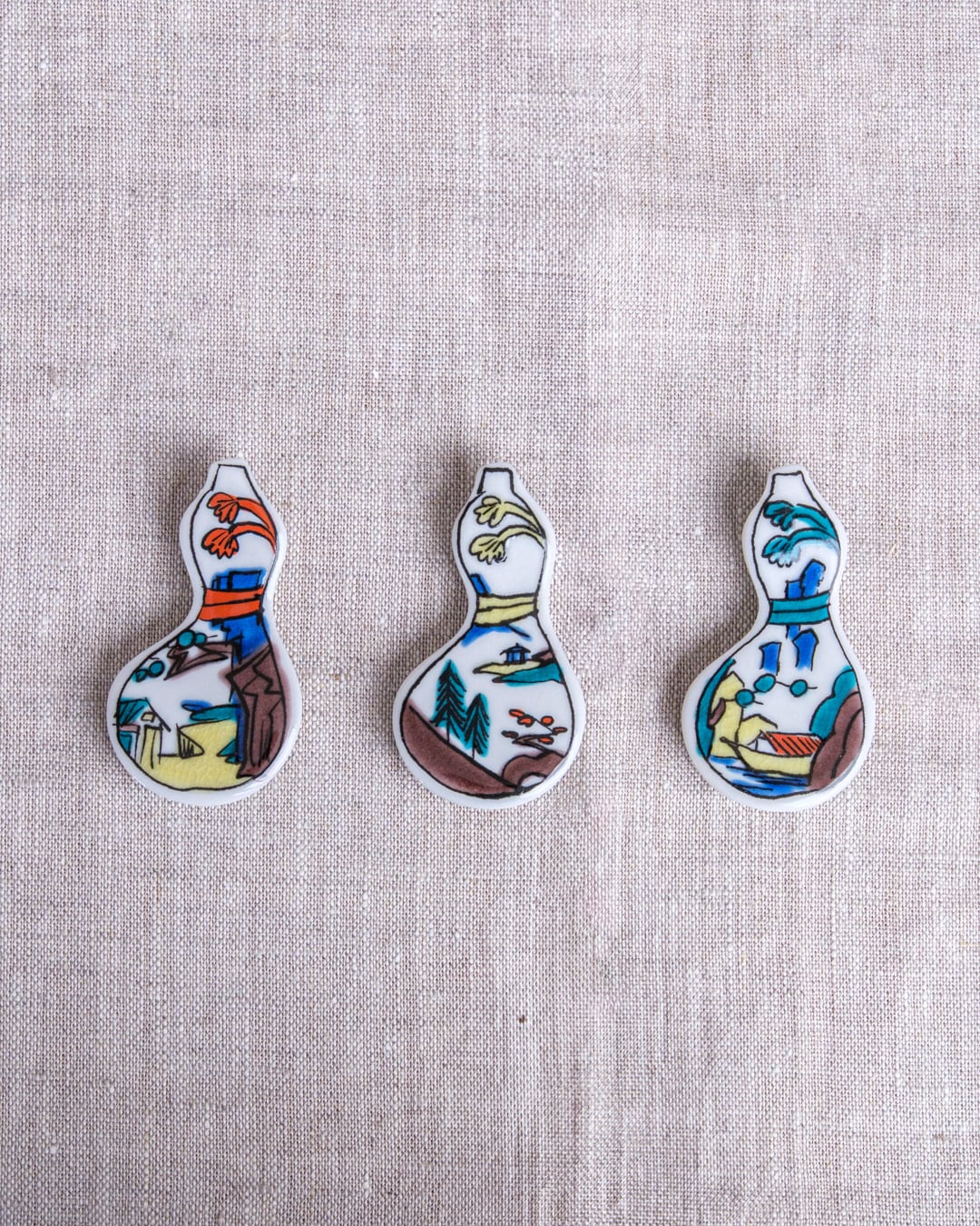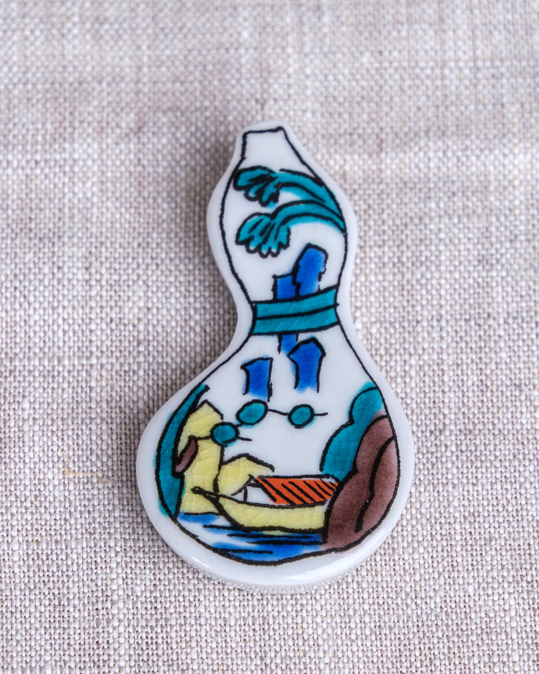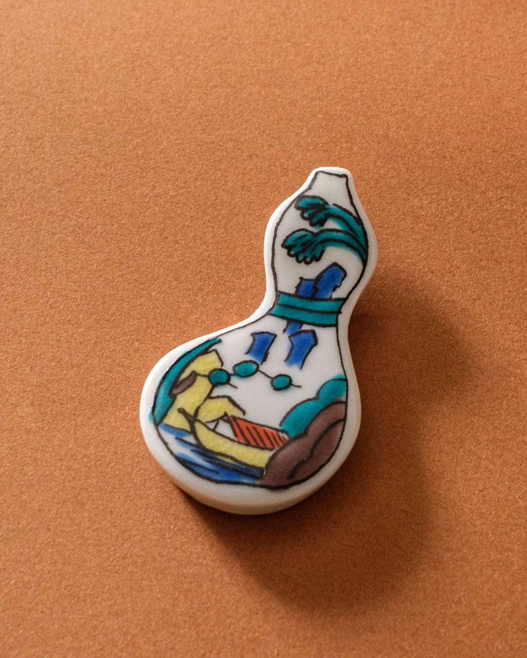 古い九谷焼でよく見られる山水文や楼閣などを瓢箪と組み合わせてデザインしました。
