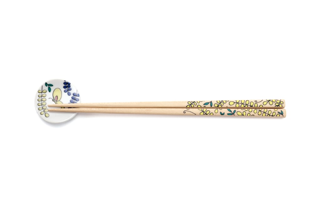 箸:箸の裏側には小さな蝶のワンポイントが隠れています。絵柄は天然のメープル材に、高度なシルク印刷によって表現されており、箸頭に塗られたそれぞれのカラーリングも本シリーズのかわいらしさを際立たせています。