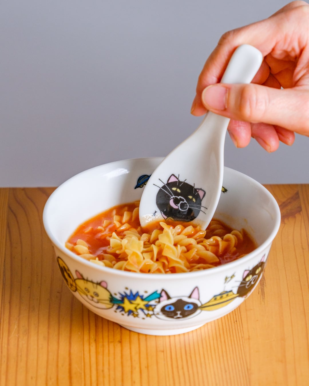 お豆腐やゼリーやプリン、中鉢と合わせてスープやお茶漬けに使うのもかわいいれんげです。満足そうなくろねこの表情とともにお楽しみください。