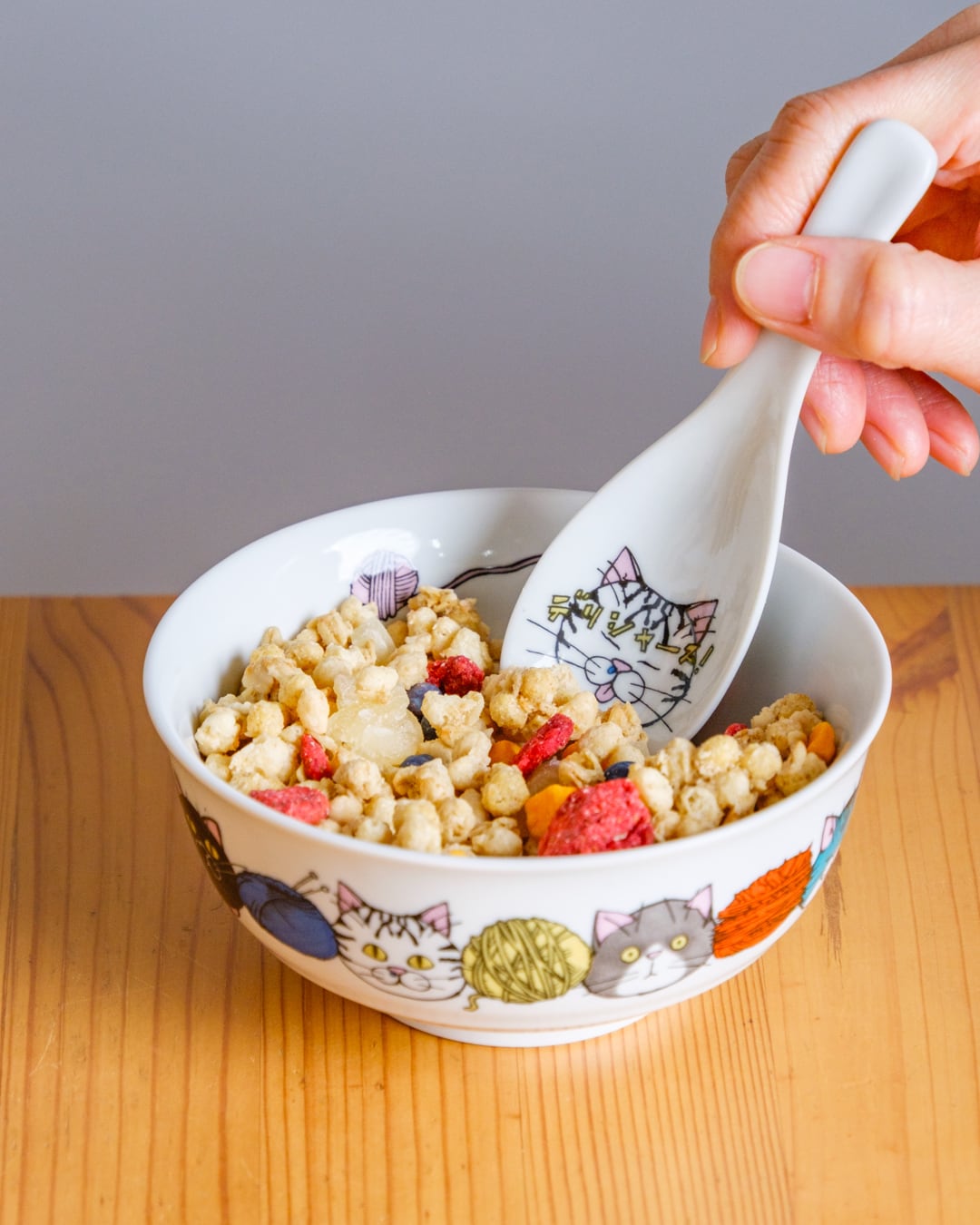 お豆腐やゼリーやプリン、中鉢と合わせてスープやお茶漬けに使うのもかわいいれんげです。満足そうなタビー柄の猫の表情とともにお楽しみください。