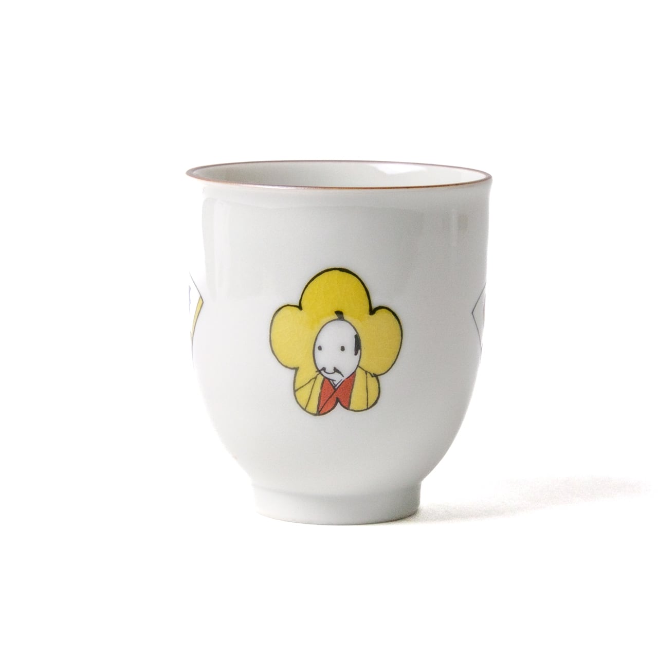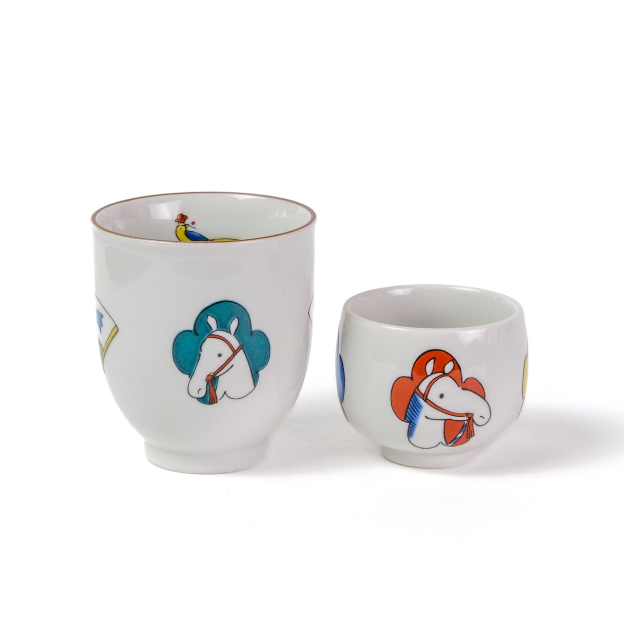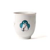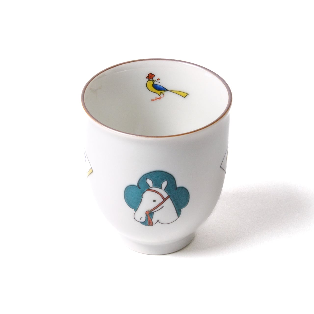 2026年干支の「馬」とKUTANI SEALではおなじみの「殿様」を、梅の形で囲ったかわいい湯呑です。内側には梅の枝をくわえた小鳥がいます。
