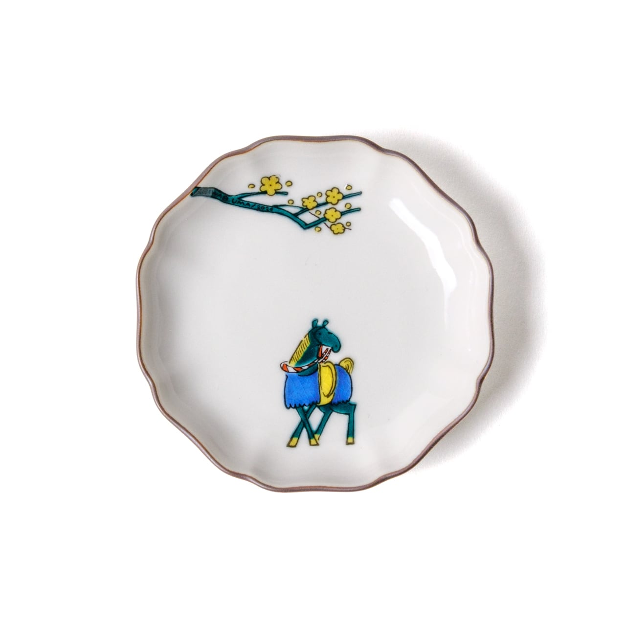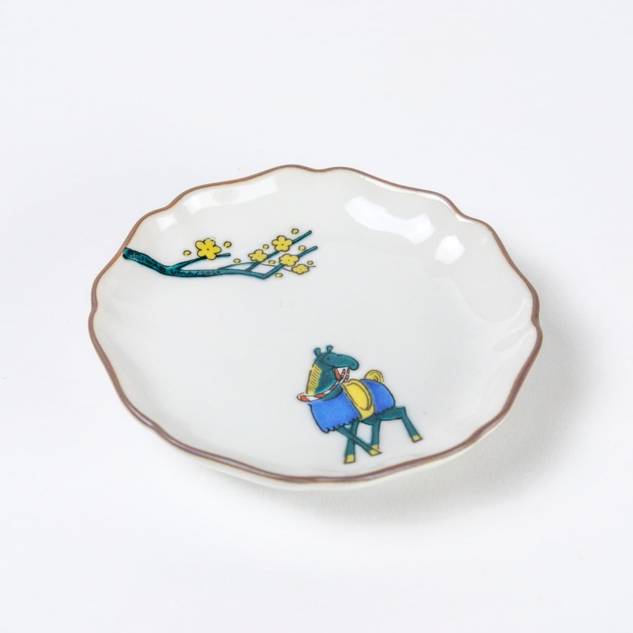黄梅の下に静かにたたずむ、2026年干支の「馬」の和風のかわいい小皿です。