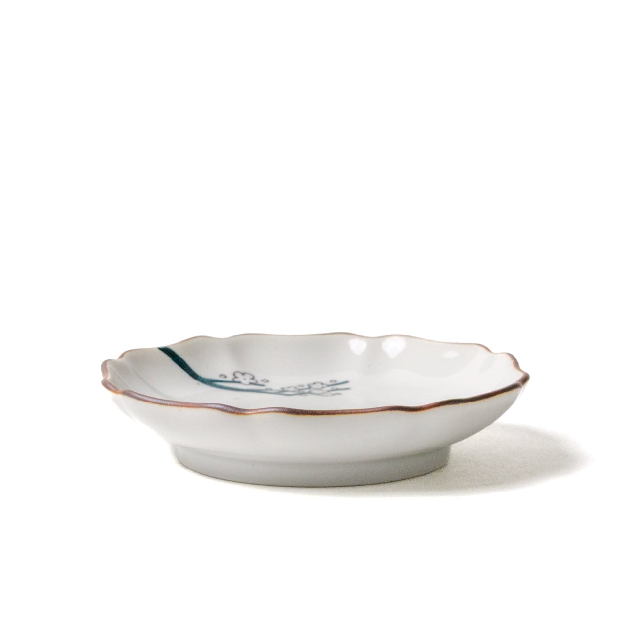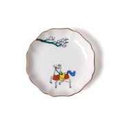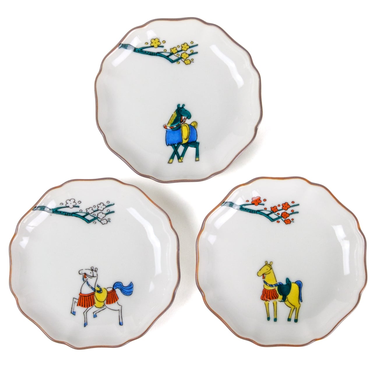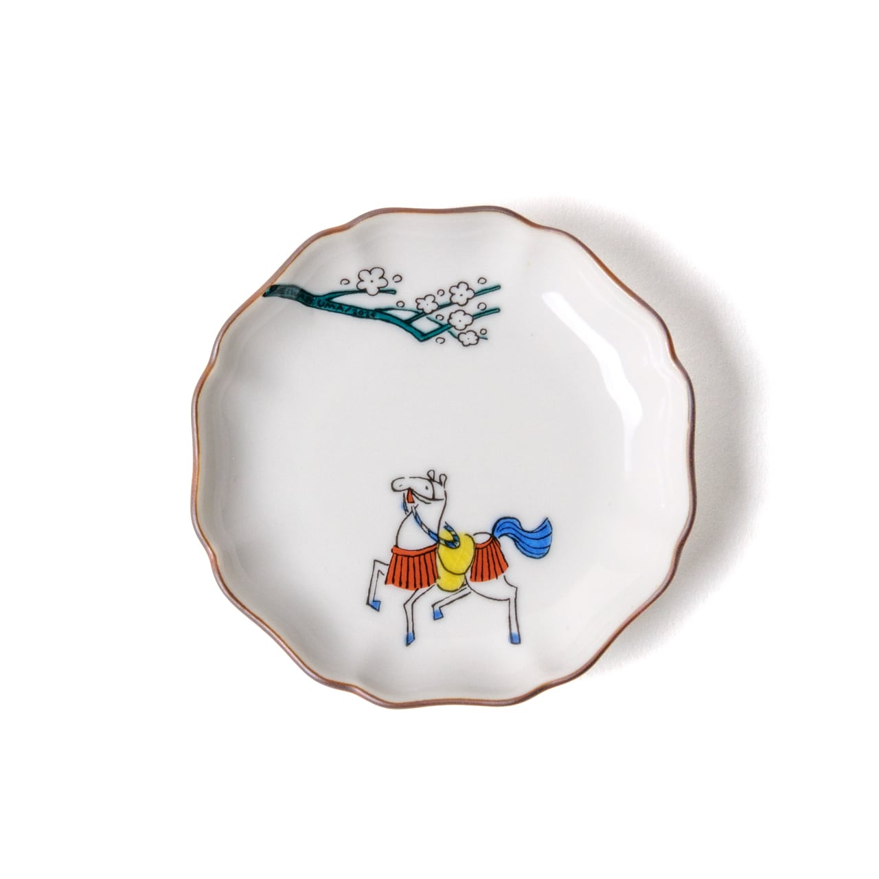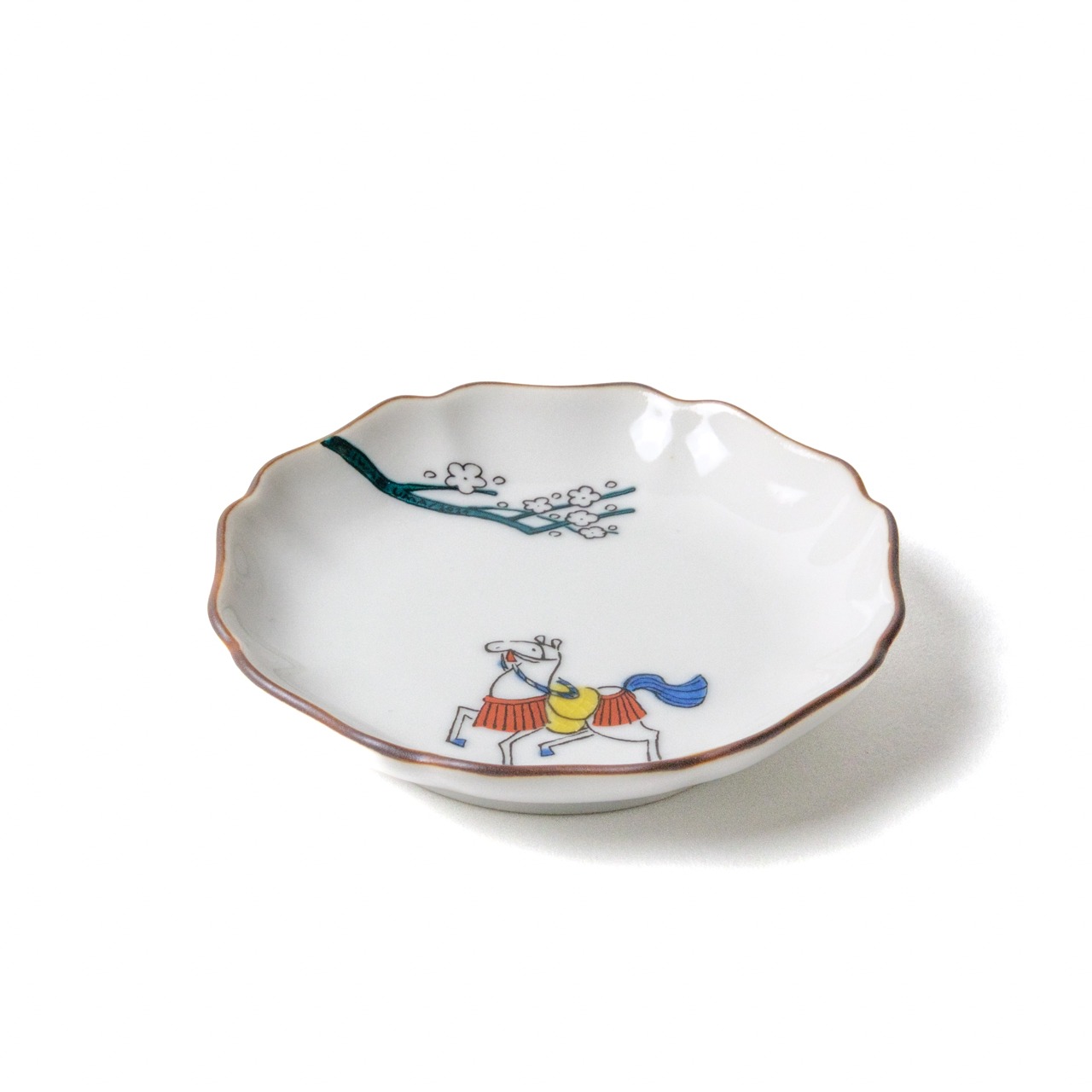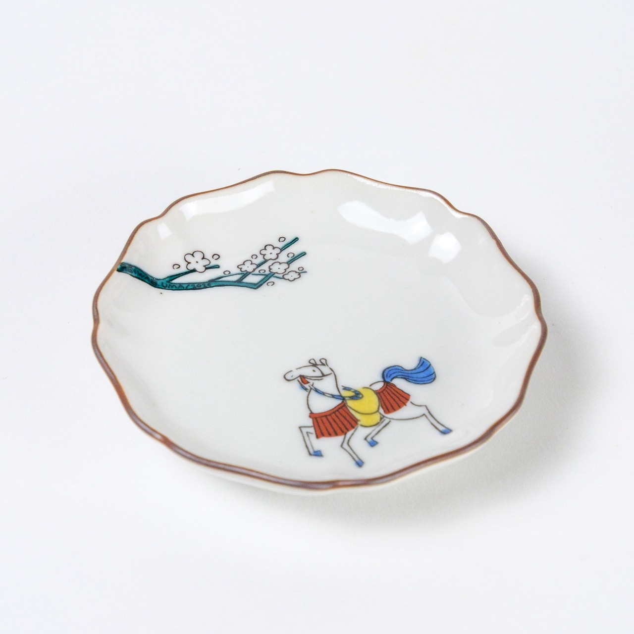 白梅の下に静かにたたずむ、2026年干支の「馬」の和風のかわいい小皿です。